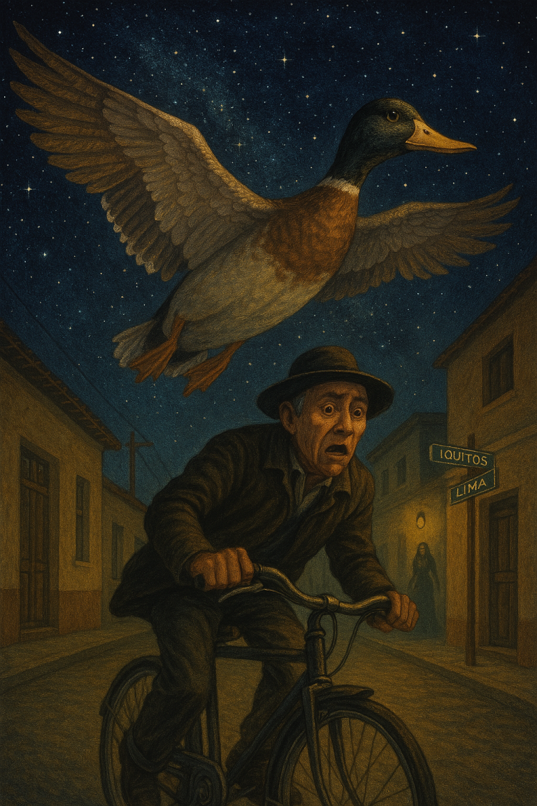Don Santos, trabajador de la ex hacienda Casa Grande, se encontraba de guardián en el bosque a la altura del Puesto de la Policía, cierto día, sintió, un frío terrible, que no podía soportarlo, entonces tomó la decisión de ir inmediatamente a su casa en su bicicleta a ponerse un abrigo, era aproximadamente la 1.30 de la madrugada, Don Santos, iba con mucha cautela para no ser visto por el guardián de la población para no se le quiten su tarea por abandono de trabajo, a la altura del campo de lista de los trabajadores de la Empresa (Av. Arequipa) escuchó golpes en el aire, miró hacia el cielo claro y despejado, estrellado y centellante y avistó un enorme pato volando, que se dirigía hacia la población, se dice que cuando las cosas son malas, el pánico se apodera de la persona. El temor lo invadía por entero, sus pensamientos se proyectaron a sus hijos y tuvo espanto de la noche y del muerto, de las ánimas y de la brujería, después de un gran esfuerzo se dio aliento y aceleró a lo que pudo en su bicicleta dándose valor que de lo que ha visto no era realidad… pero al llegar a la intersección de las Calles Iquitos y Lima el enorme pato termina su vuelo y luego se convierte en una mujer, que al pestañear desaparece.